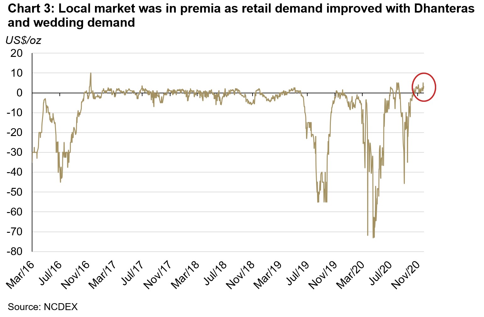 The local gold price was back in premium by mid-October, just ahead of the Navratri festival. With the arrival of Dhanteras in November and wedding-related purchases, the average premium remained at ~ US$2/oz during November (Chart 3).