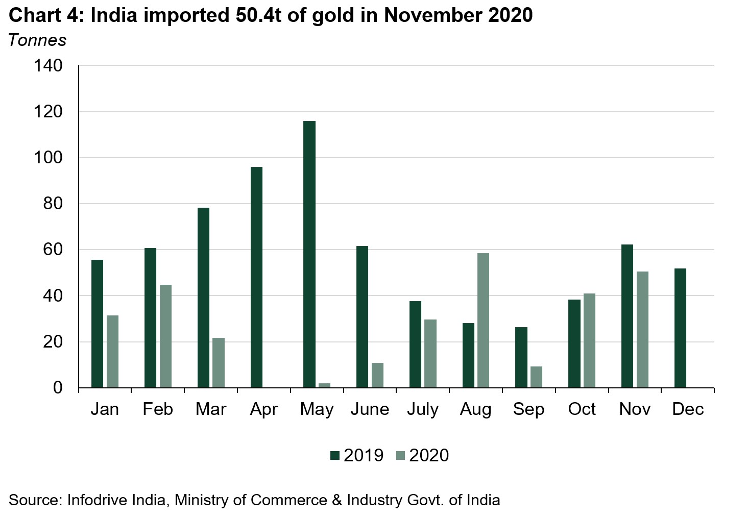 Indian official gold imports recovered to 50.4t in November – 23% higher m-o-m but 19% lower y-o-y. Gold imports remain very weak on a y-t-d basis – 55% lower than the same period in 2019 (Chart 4). A total of ten banks, nominated agencies and exporters imported 38.1t of bullion during the month, and 16 refineries imported 12.3t of gold doré (fine gold content).
