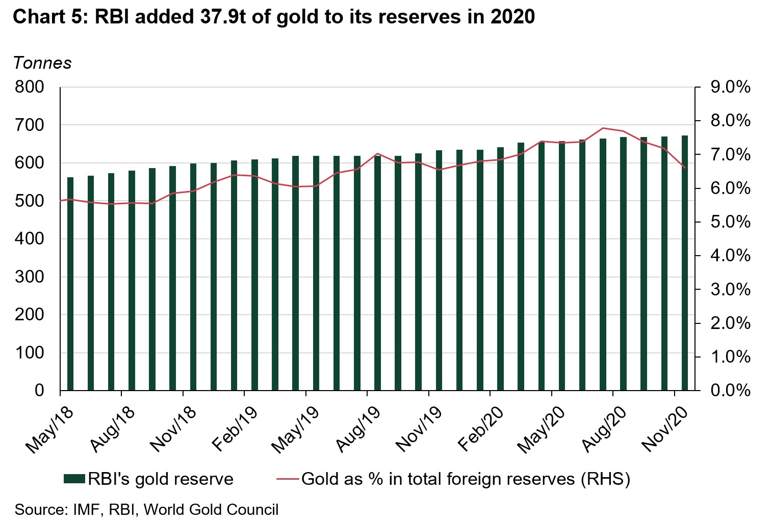 - The Reserve Bank of India (RBI) has added 37.9t of gold y-t-d in 2020.