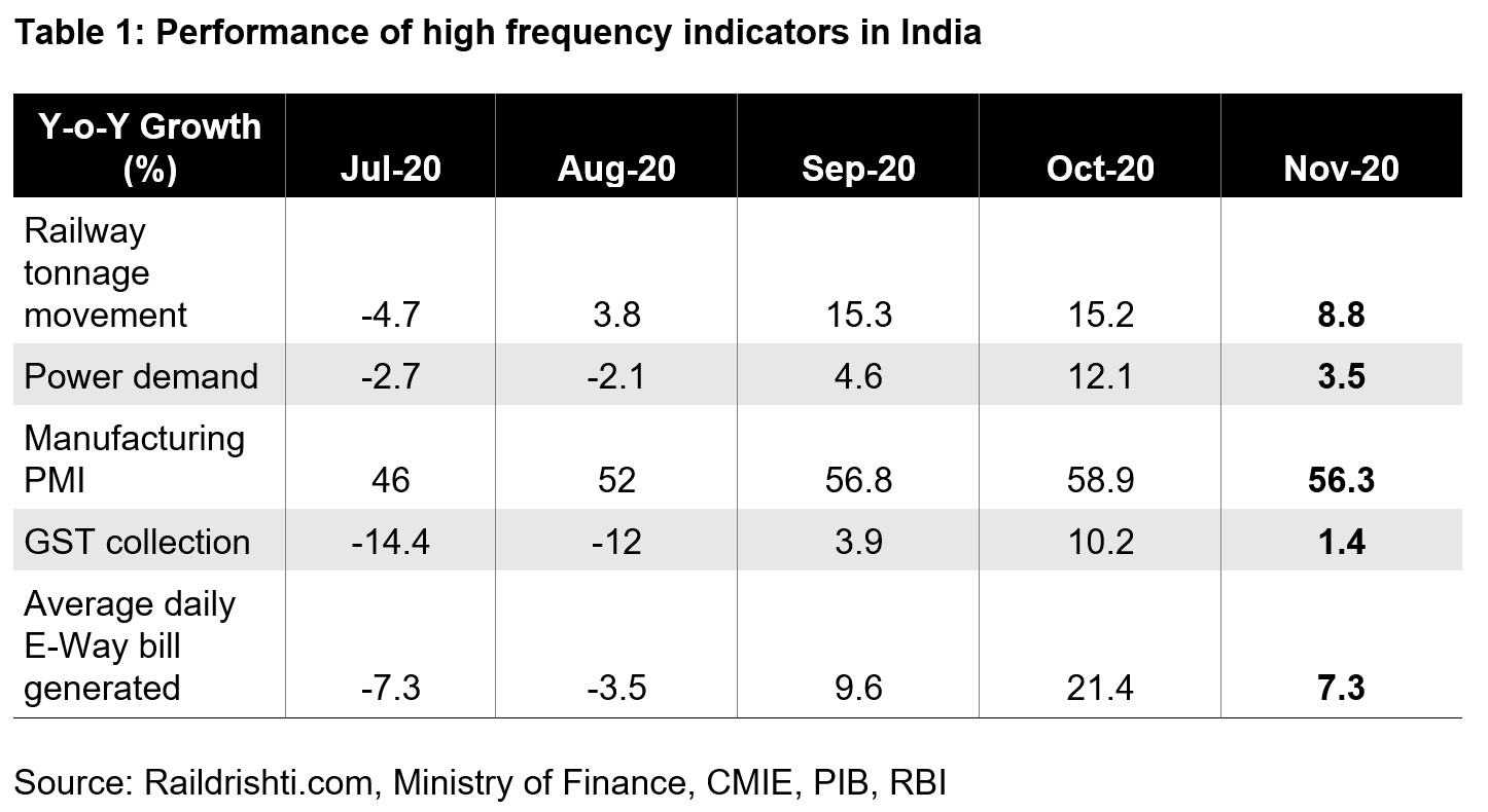 - Improvement in consumer confidence following the easing of lockdown restrictions and improved economic activity: the RBI’s consumer confidence index increased to 52.3 in November from 49.9 in September.