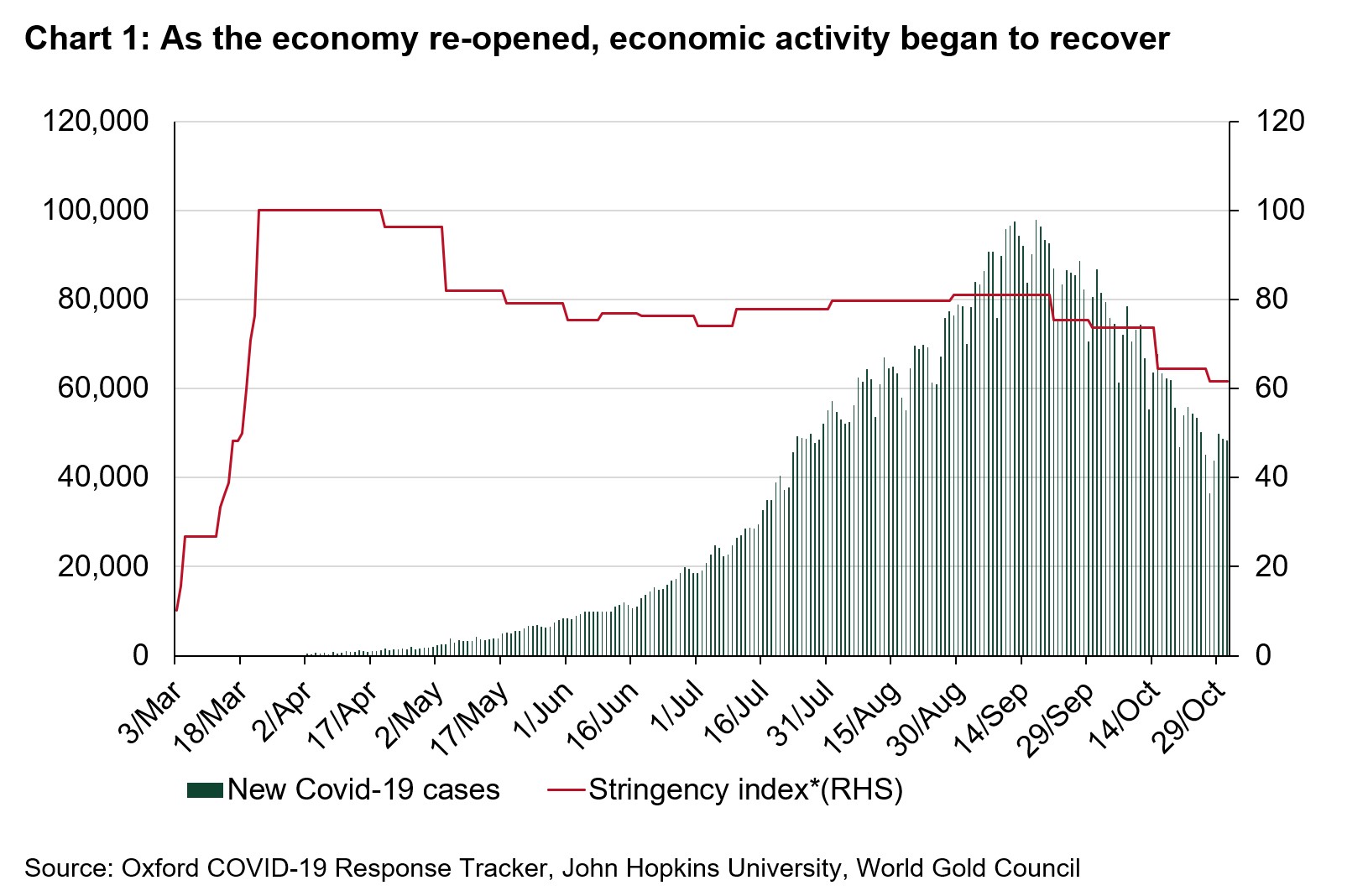 Daily new COVID-19 cases averaged ~62,000 during the month, down from ~87,000 in September. With lower daily infections lockdown restrictions were eased throughout India, helping the economy recover (Chart 1).