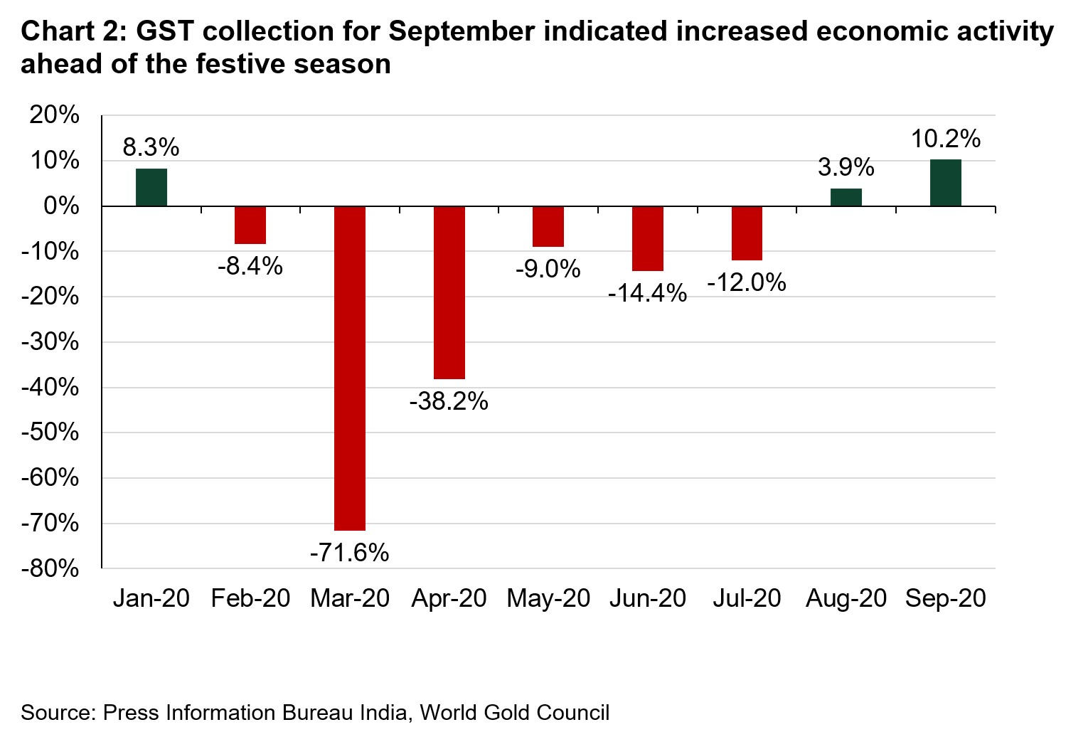 With an improvement in economic activity, GST collection for the month of September touched an eight month high at INR 1.05tn (10.2% higher y-o-y), reaching a pre-COVID level of GST collection last seen in February (Chart 2).4