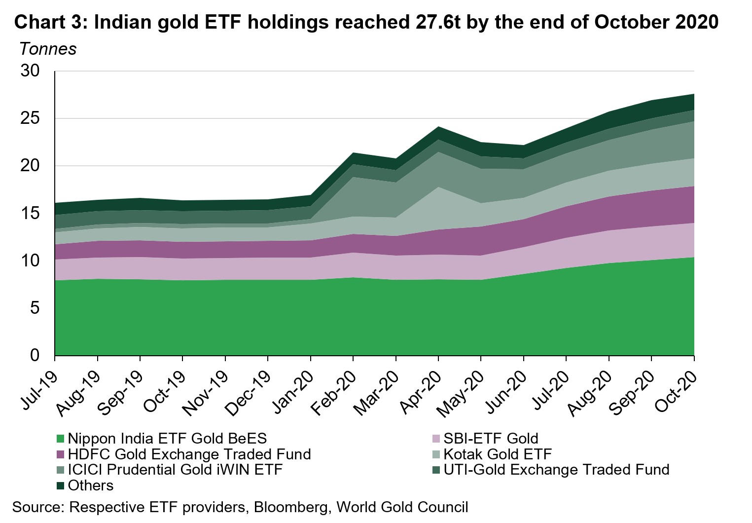 Indian gold ETFs saw inflows during the month, the seventh consecutive month of AUM growth. This was supported by safe haven demand and strong returns on gold y-t-d (29.6%). Gold has outperformed the BSE SENSEX (-2.8%) and 10-year government bonds (10.6%), supporting gold’s appeal as an asset.5 However, the net inflows of US$42.8mn were 40% lower m-o-m as some investors switched into equities (BSE SENSEX: + 4.1% m-o-m) as the economy improved and optimism grew over a potential coronavirus vaccine. Against such a backdrop, net inflows into Indian gold-backed ETFs were 0.7t during October, pushing total gold holdings to 27.6t by the end of the month (Chart 3).