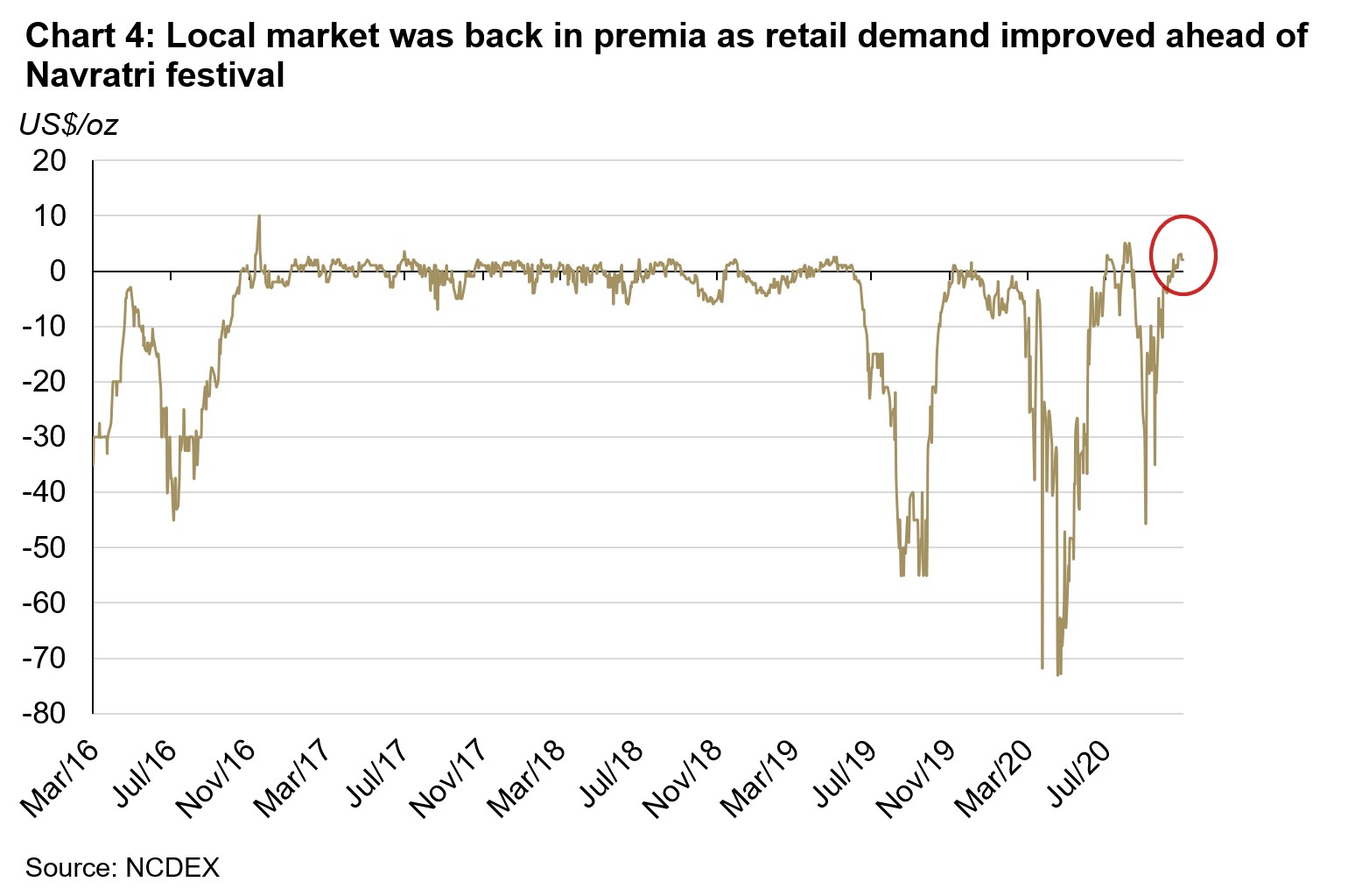 Local discount narrowed from US$40/oz to US$3/oz during September due to a gradual revival in retail demand and stocking by jewellers ahead of Navratri and the upcoming wedding season. Despite this, the local gold price was back in premium by mid-October, just ahead of the Navratri festival, with the average premium remaining at ~ US$2/oz during the second half of October (Chart 4).