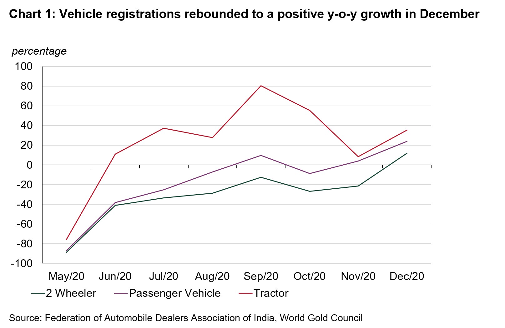 Vehicle registrations among various categories rebounded to a positive y-o-y growth in the month after some moderation in November (Chart 1). This shows momentum in the economic recovery holding up in December.
