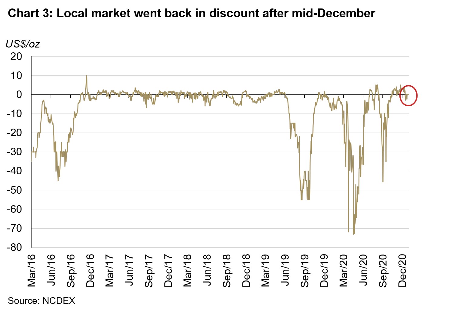 With jewellery demand tapering off at the start of Kharmas, the local gold price was back in discount for the last two weeks of December. The average discount remained at ~ US$1/oz during the last two weeks of the month (Chart 3).