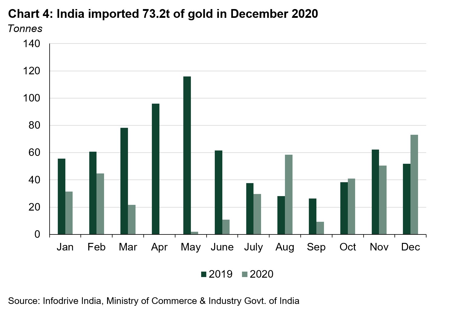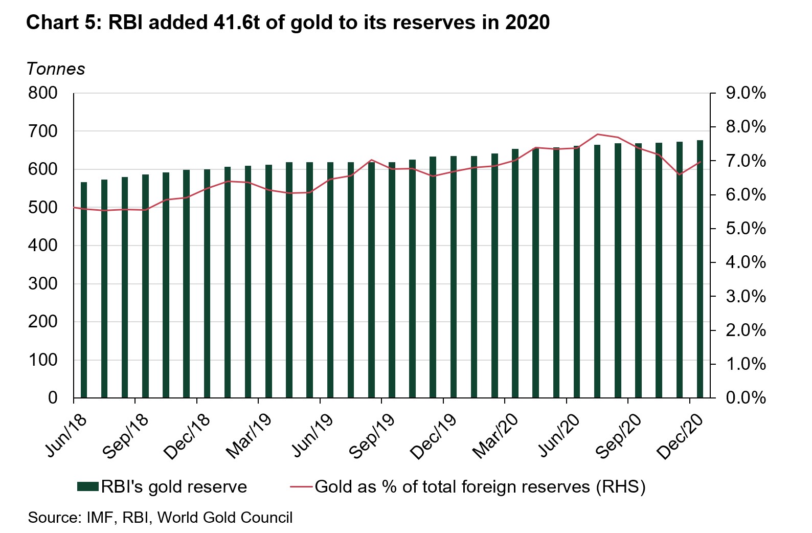 - The Reserve Bank of India (RBI) added 3.7t of gold in December and 41.6t in 2020