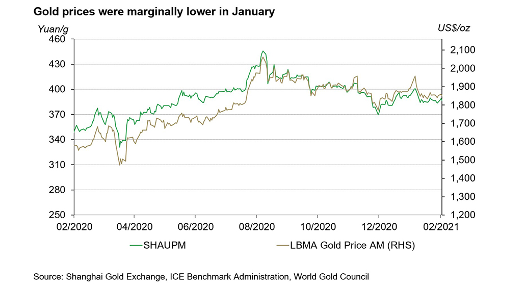 - Both the LBMA Gold Price AM in US dollars (USD) and the Shanghai Gold Benchmark Price PM (SHAUPM) in renminbi (RMB) witnessed slight declines during the first month of 20211