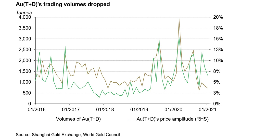 Au(T+D)’s trading volumes totalled 729t in January, the second consecutive monthly decline