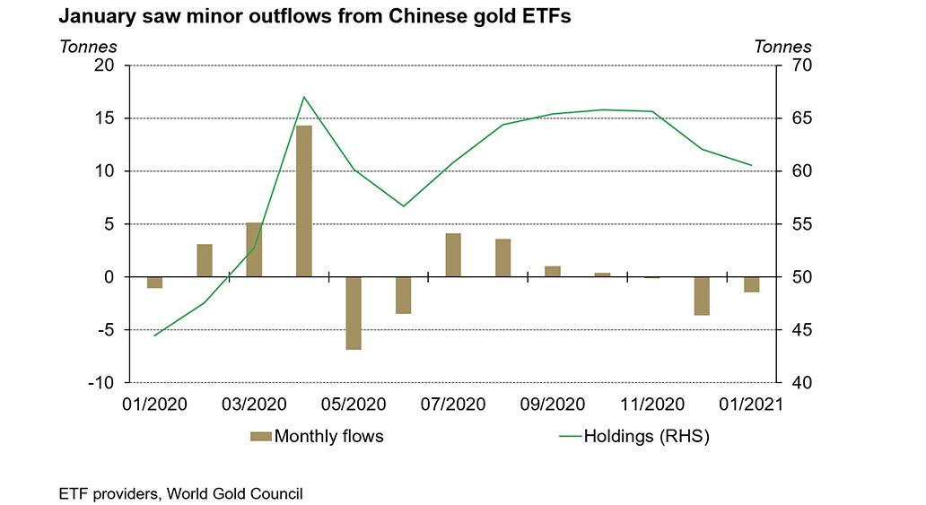 Chinese gold ETF total holdings stood at 60.6t at the end of January, following a 1.5t net outflow during the month