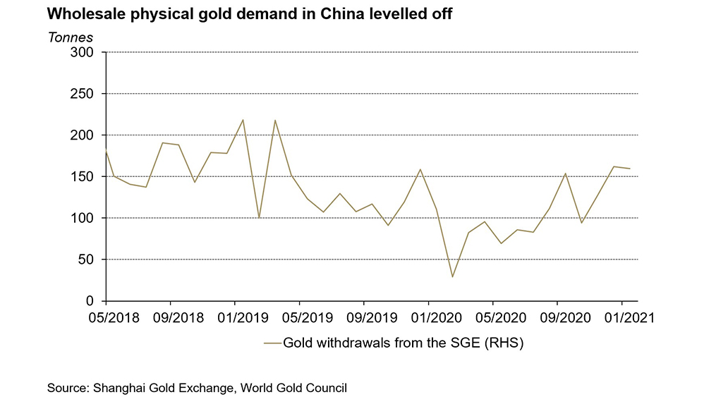 - Gold withdrawals from the Shanghai Gold Exchange (SGE) levelled off at 159t last month – compared to 162t in December – as gold sales remained buoyant ahead of the Chinese New Year (CNY) holiday.