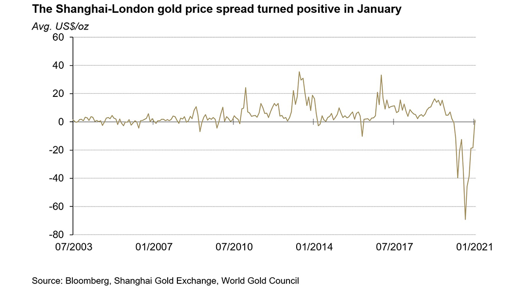 - The monthly average Shanghai-London gold price spread turned positive for the first time in 11 months, averaging US$1.1/oz2