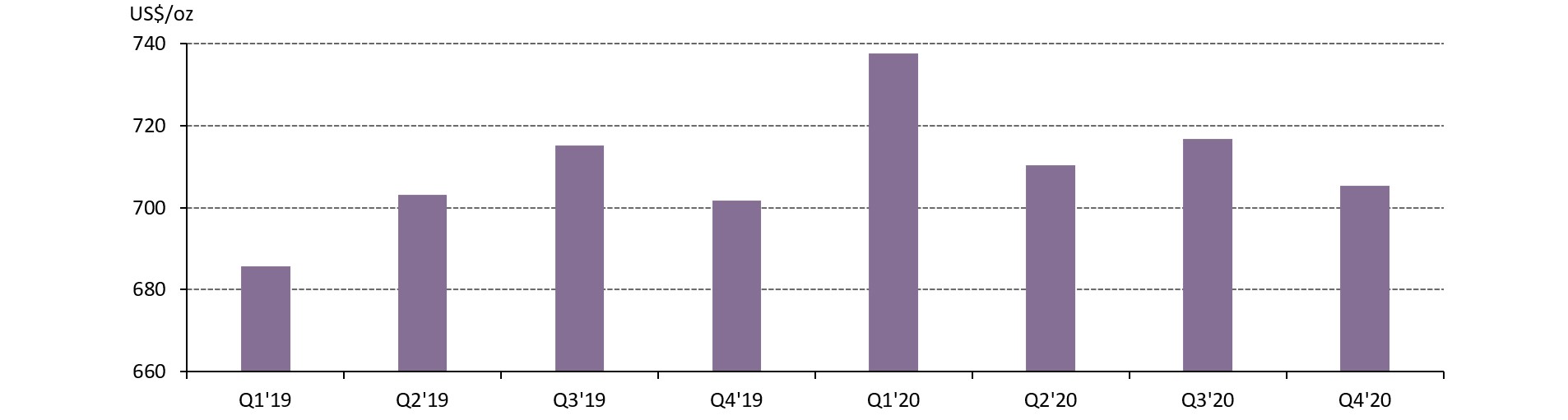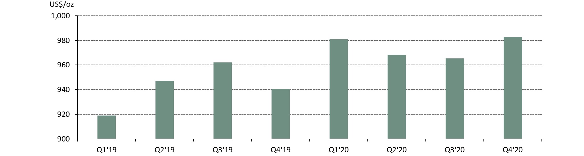 The falling TCC was largely a result of continued easing of COVID-19 disruptions on mining operations. The impact of the pandemic on gold output was concentrated in Q2 as miners in several countries were forced to temporarily halt operations from mid-March. While most of these restrictions were lifted by the end the quarter, the ramping-up of some mines to full capacity continued into Q3 leading to constrained output and higher costs at these operations. By Q4, the vast majority of gold mines were back to operating at full capacity, leading to a drop in average operating costs q-o-q. A small increase in average grade, from 1.38g/t in Q3 to 1.40g/t in Q4, alongside a price driven fall in royalties, also contributed to the decline in TCC q-o-q.