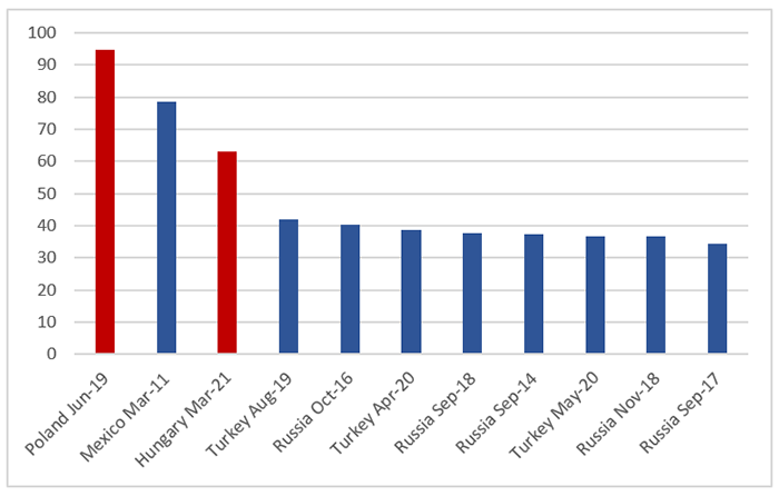 Poland, Hungary and Serbia increased their gold holdings quite sharply. The 100-tonne purchase by the NBP and the 63-tonne purchase by the MNB mark two of the three largest single monthly central bank gold buys over the last decade (see Chart 3). The NBP’s and MNB’s decisions to purchase gold were strategic in nature, taking into account the rapid structural changes in the global economy, such as shifts in the international financial system and global consequences of the pandemic.
