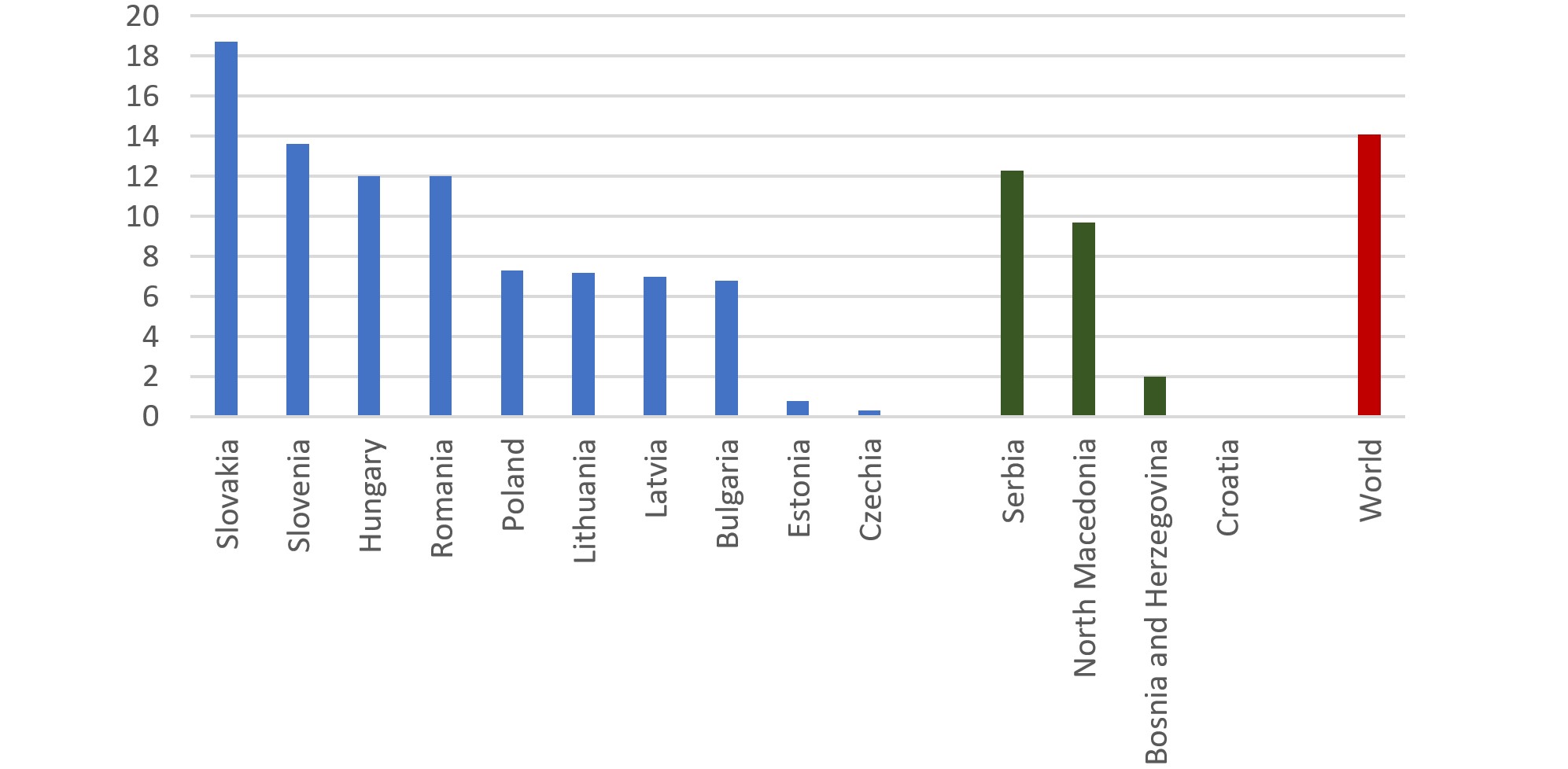 Chart 2. Gold as % of total reserves of Central and Eastern European countries of the EU and countries of the former Yugoslavia
