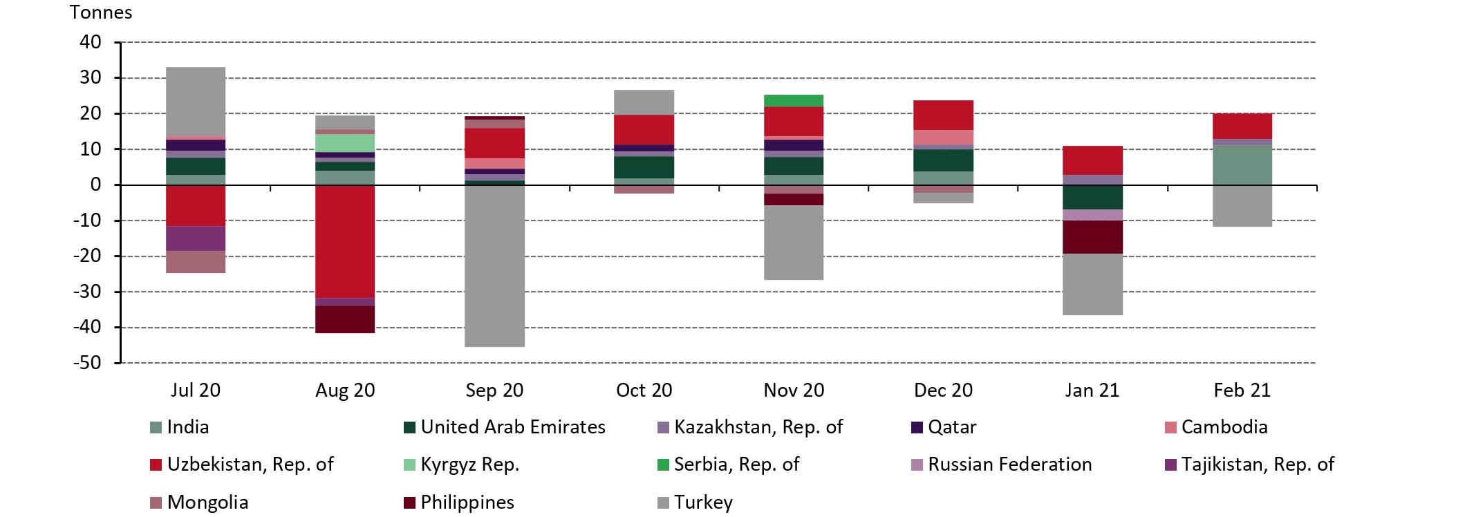 Our monthly central bank statistics have been updated today, to include initial February data reported by the IMF and respective central banks. Collectively, central banks tipped back into net purchases during the month: 8.8t were added to global gold reserves. Buying from India (11.2t), Uzbekistan (7.2t), Kazakhstan (1.6t), and Colombia (0.5t) outweighed the only notable sale of gold by Turkey (-11.7t).1 Year-to-date, this puts total global central bank net sales at 16.7t, the weakest start in over a decade.