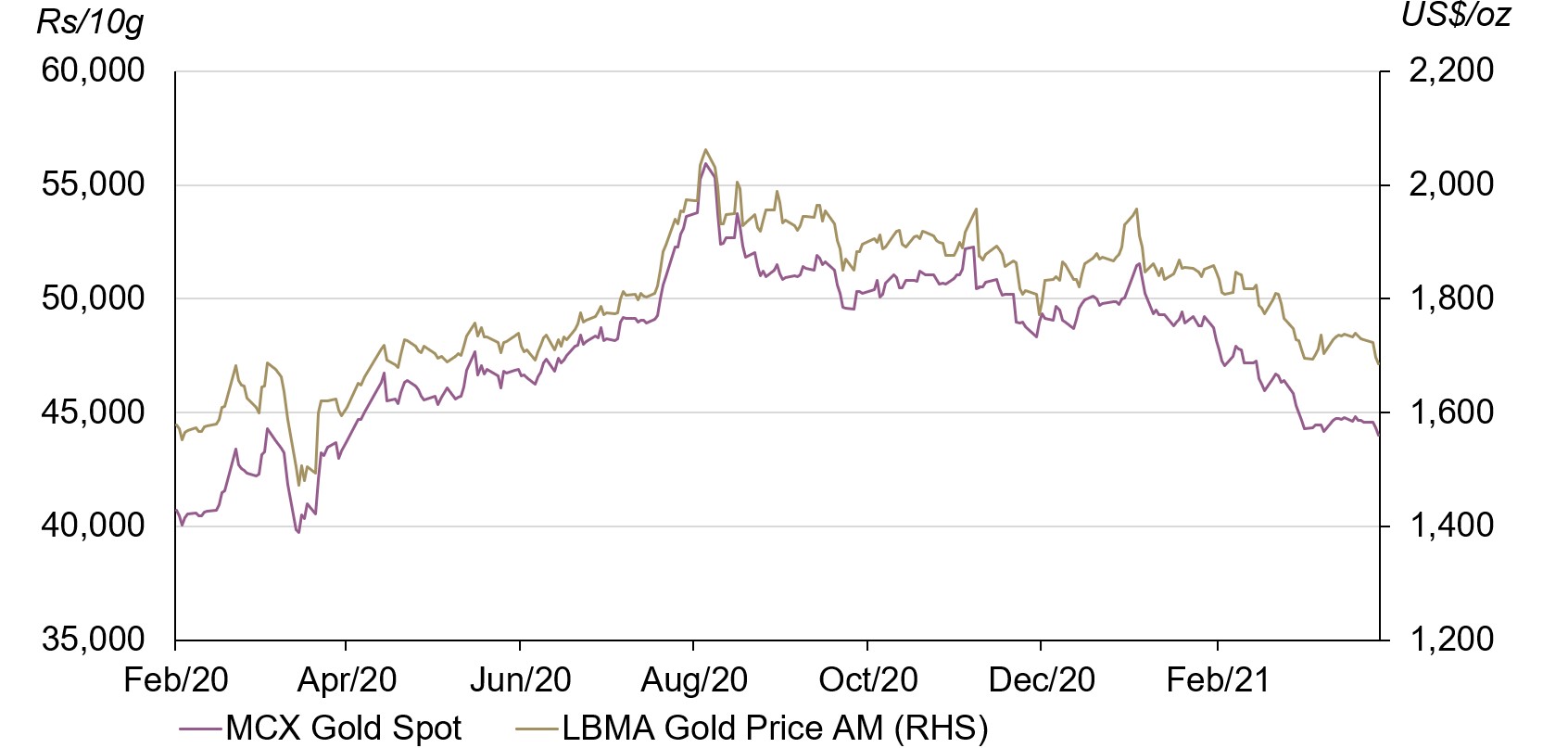The US 10-year bond yield rose by 34bps during the month to end at 1.74%, while the US dollar strengthened by 2.6% to 93.2. The rising bond yields and stronger dollar index pushed down both the LBMA Gold Price AM and MCX Gold Spot (Chart 1).2
