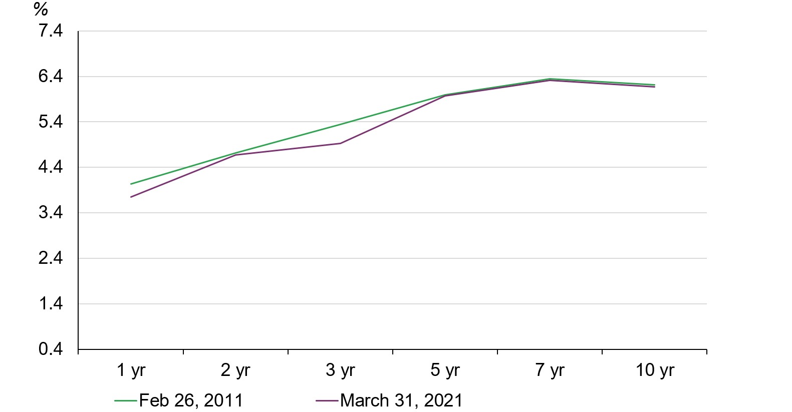 The 10-year Indian government bond (G-sec) declined marginally by 6 bps compared to a rise of 32 bps in February, whilst rates along the medium maturities (3-5 years) have seen a fall of 6-40 bps compared to a much larger spike (90-100 bps) last month. Bond yields have declined in the month mainly due to the RBI’s actions, such as the so-called Operation Twist and the devolvement of two auctions, ensuring G-sec yields will likely not go much higher in the near future (Chart 2).3 The RBI intends to keep a lid on bond yields so that government borrowing cost is lower to support the economy.