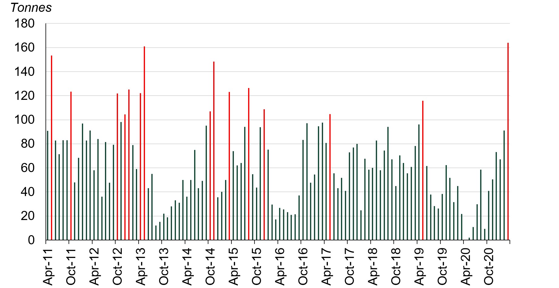 Indian official gold imports totalled 164t in March 2021, almost eight times higher y-o-y. Official imports in March were the highest in a decade; this is only the third time over the 10-year period that official imports have exceeded 150t on a monthly basis (Chart 4). We believe that robust retail demand – on the back of the lower gold price and wedding demand – along with re-stocking by jewellery manufacturers and retailers, are the factors responsible for driving official imports to such a high level. A total of 11 banks, nominated agencies and exporters imported 142.9t of bullion and 20 refineries imported an equivalent 21t of fine gold content in the form of gold doré. From a total 164t of official imports, 75.3t was imported via the Sri City Free Trade Warehousing Zone (FTWZ).5 Eight overseas banks accounted for these imports with JP Morgan, ANZ, Rand Merchant Bank and Standard Chartered accounting for 85%.