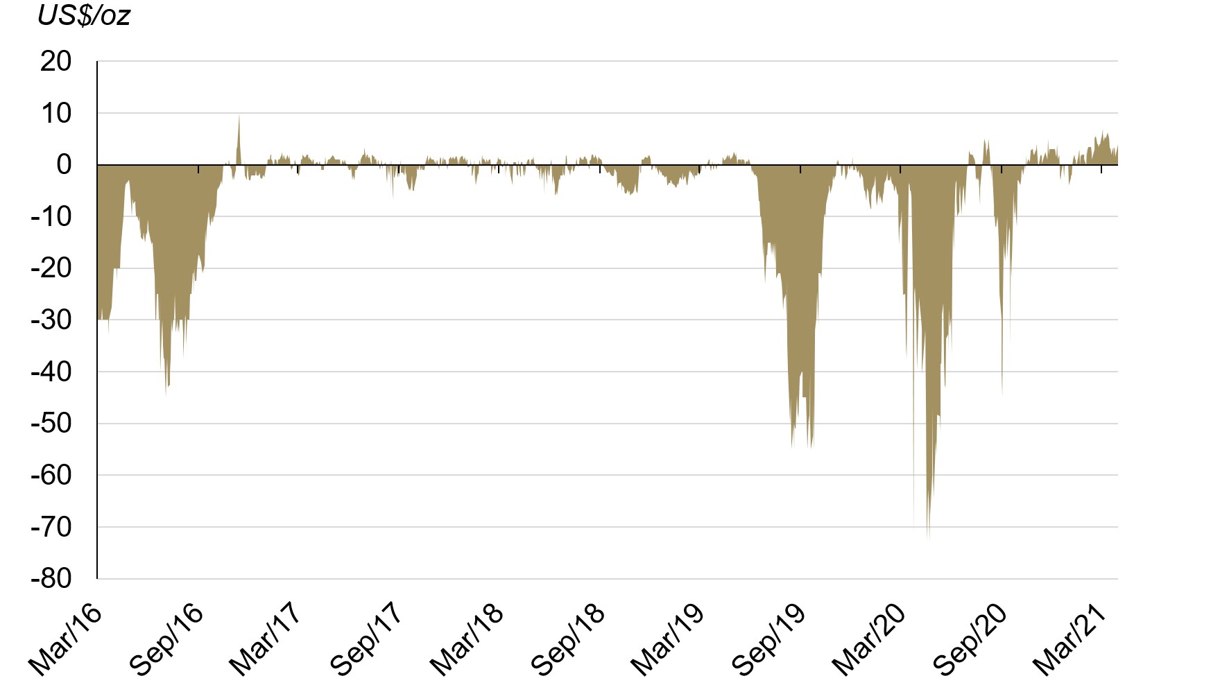 With a significant pick-up in retail demand the monthly average premium in March jumped to US$4.2/oz compared to an average of US$3.3/oz in February. The local premium rose to a 51-month high of ~US$6.5/oz in the first week of the month before moderating to US$3.5/oz by the end of the month (Chart 5).