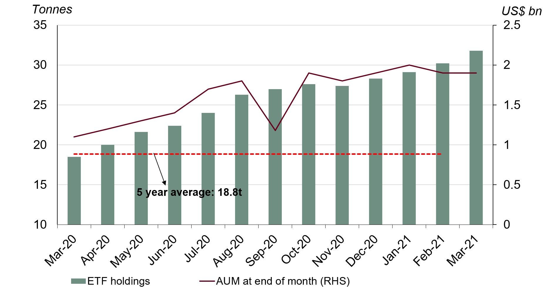 Anecdotal evidence suggests that the lower domestic gold price provided a welcome entry point for investors. Against the backdrop of a second wave of COVID-19, volatility for the MCX Gold Spot hit 17.8% in March, higher than the LBMA Gold PM (13.06%).6 A lower gold price, higher domestic gold price volatility and safe-haven demand lured investors towards gold ETFs. Inflows increased by 1.6t (Rs 6.62bn; US$96.1mn) taking total gold ETF holdings to 31.8t (Chart 6).