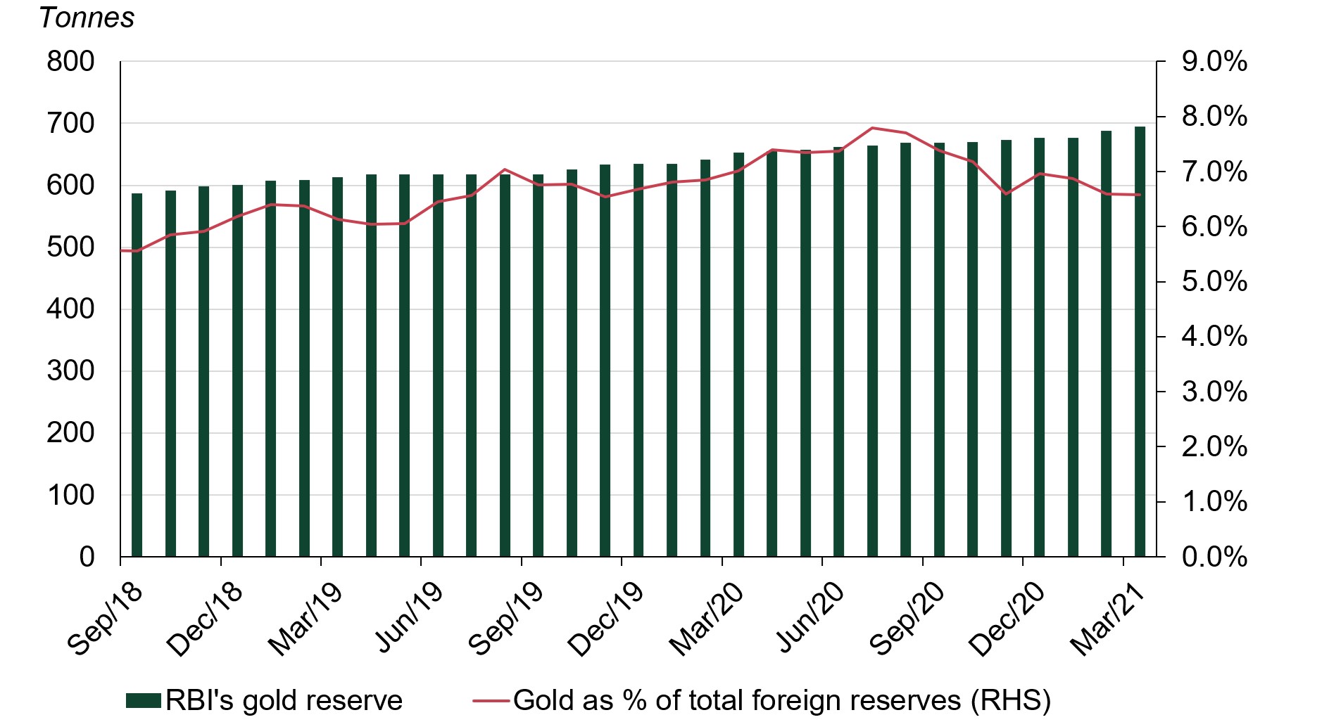 After making 11.2t of purchases during February, the RBI added a further 7.5t of gold to its reserves in March taking its gold reserves to 695.3t, or 6.6% of total reserves (Chart 7).7 The RBI has stepped up gold purchases over recent years with the aim of diversifying its foreign reserves and maintaining the safety and liquidity of its forex reserves.