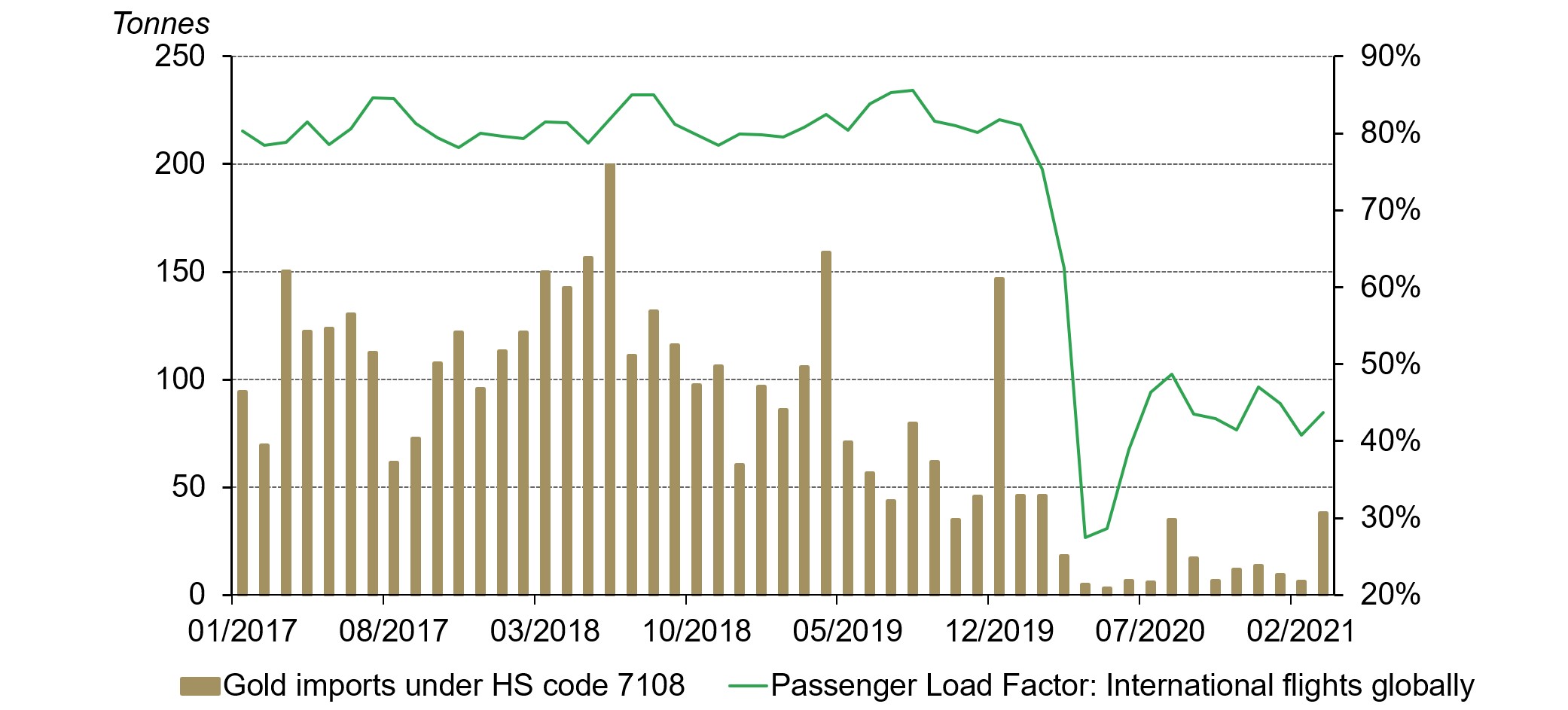 However, imports are still well below the average of 82t in 2019 - the pre-pandemic level. We believe the reduction in international flights globally and strict boarder controls in China amid the COVID-19 containment could be key factor weighing on gold flows into China.
