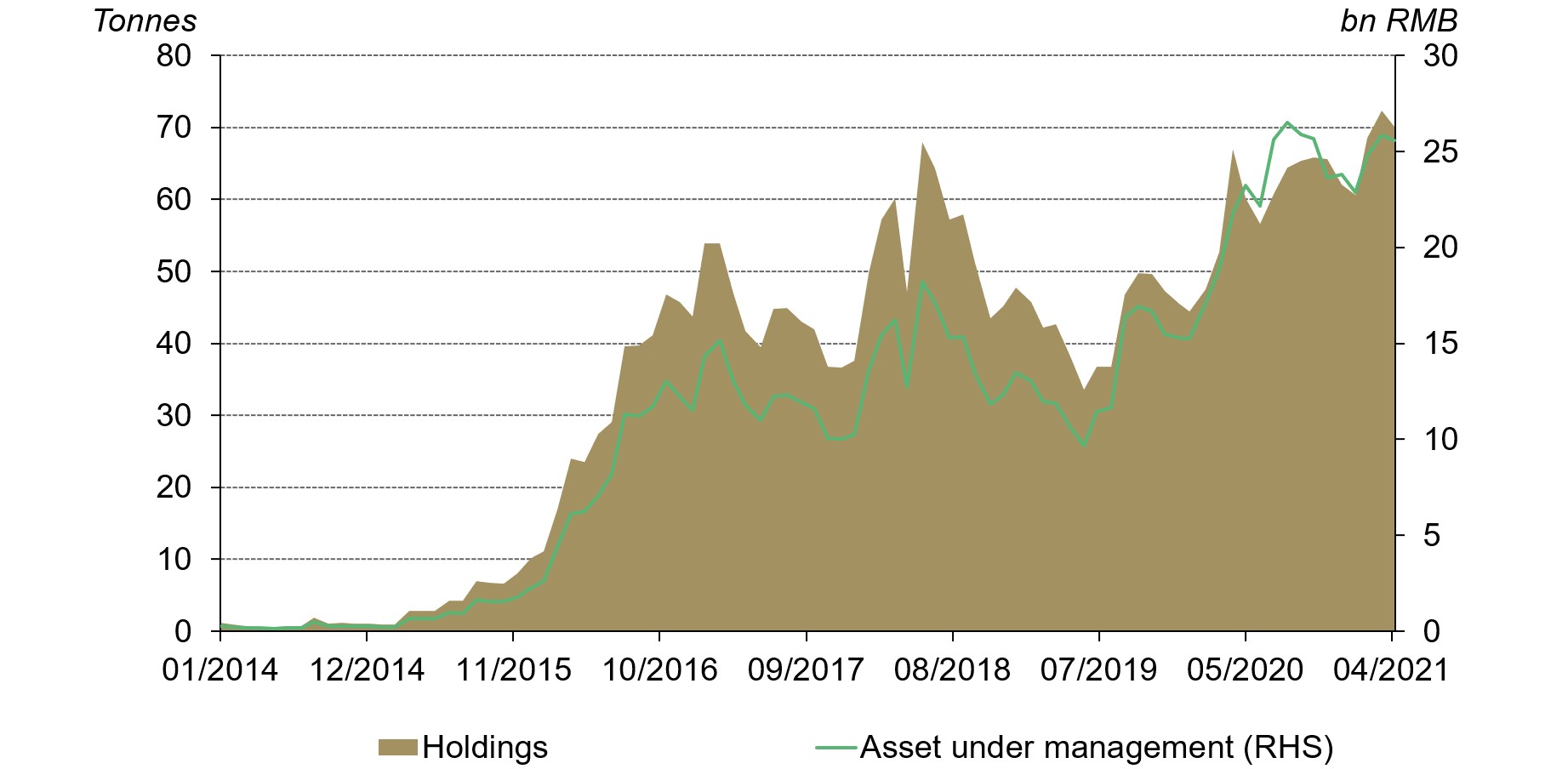 - collective holdings in Chinese gold ETFs saw a 2t (US$81mn, RMB268mn) outflow in the month