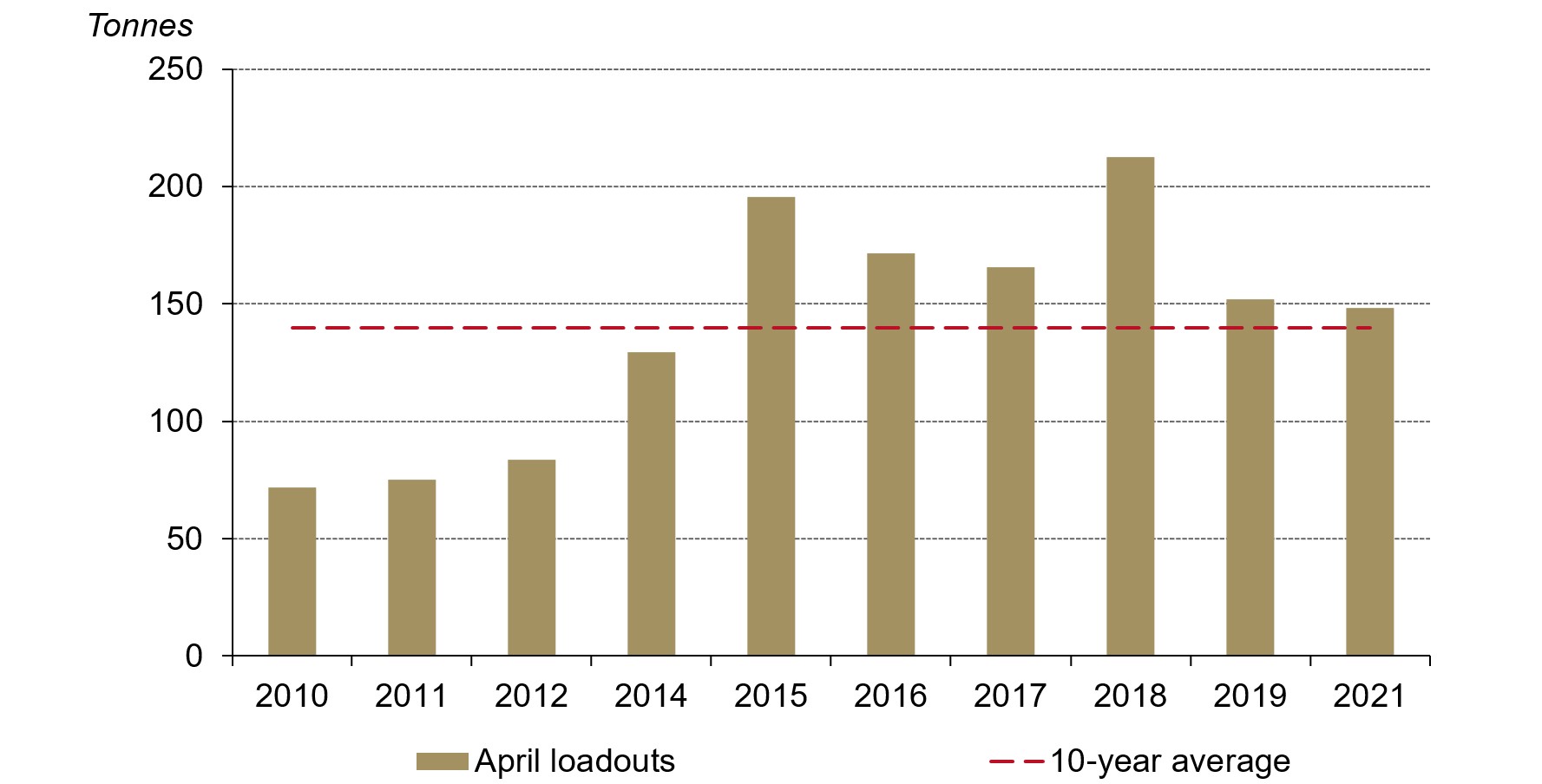 - Gold withdrawals from the SGE were seasonally lower m-o-m but higher than the 10-year average of April loadouts