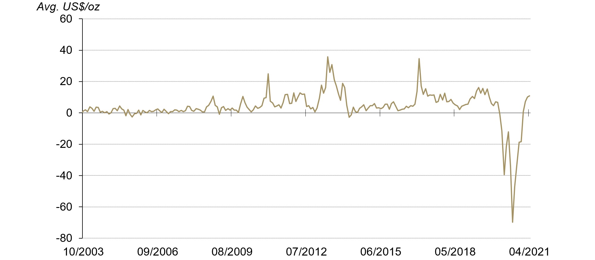 - The Shanghai-London gold price spread saw a slight m-o-m rise in April, averaging US$11/oz2