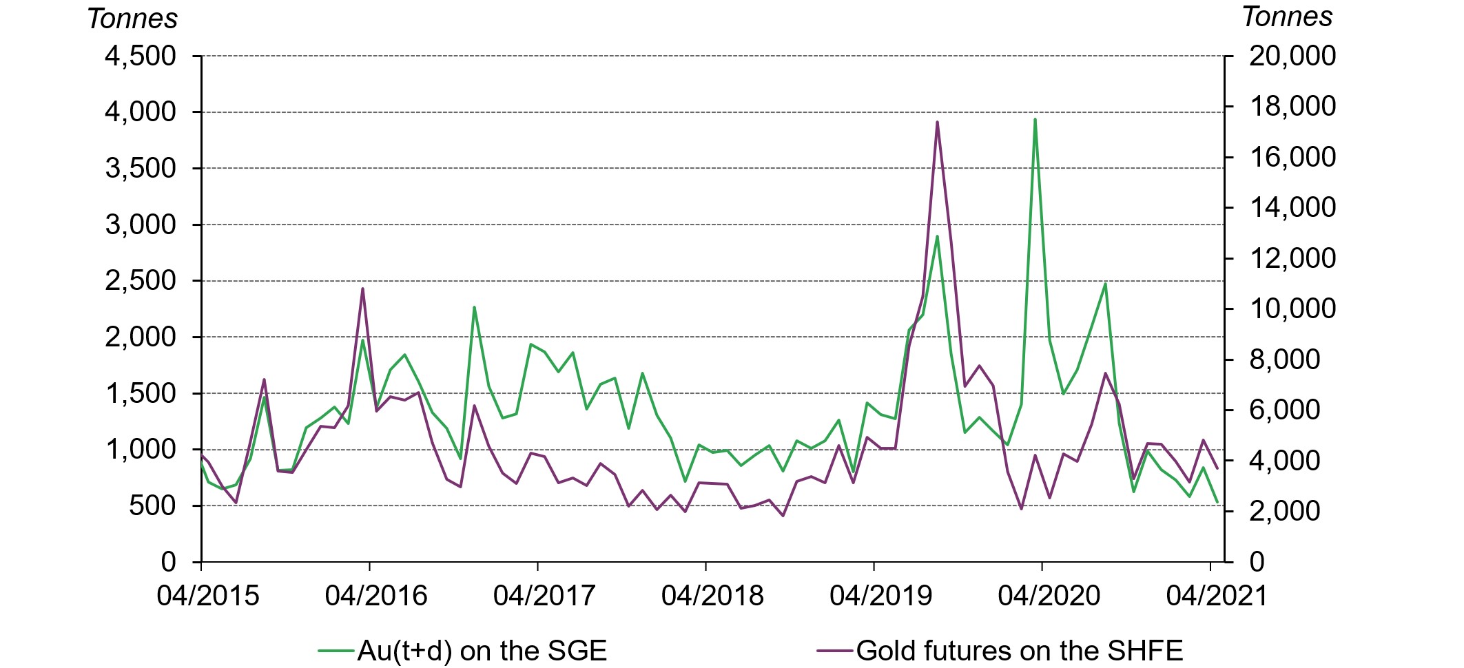 - trading volumes of Au(T+D) on the Shanghai Gold Exchange (SGE) and gold futures on the Shanghai Futures Exchange (SHFE) both dropped on a m-o-m basis