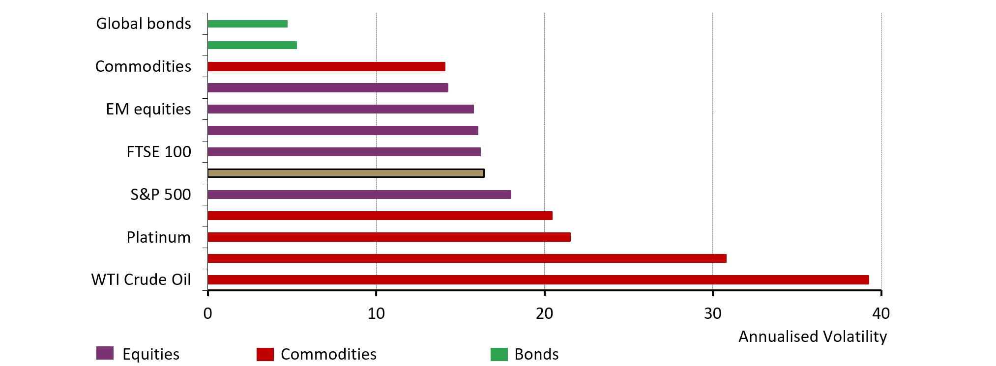 *Annualised volatility is computed based on daily returns in pound sterling between 31 December 2000 and 31 December 2020. Computations of total return indices for S&P 500 Index, MSCI Daily Gross EM, MSCI Daily Gross EAFE, LBMA Gold Price PM, Bloomberg Commodity Index, LBMA Silver Price, Bloomberg WTI Crude Oil, Bloomberg Barclays Global-Aggregate Index, S&P GSCI Copper Official Close Index, S&P GSCI Platinum Index, Bloomberg Barclays Global-Aggregate Total Return Index Value Unhedged, MSCI UK Gross Total Return Local Index, S&P U.K. Investment Grade Corporate Bond Index Total Return.