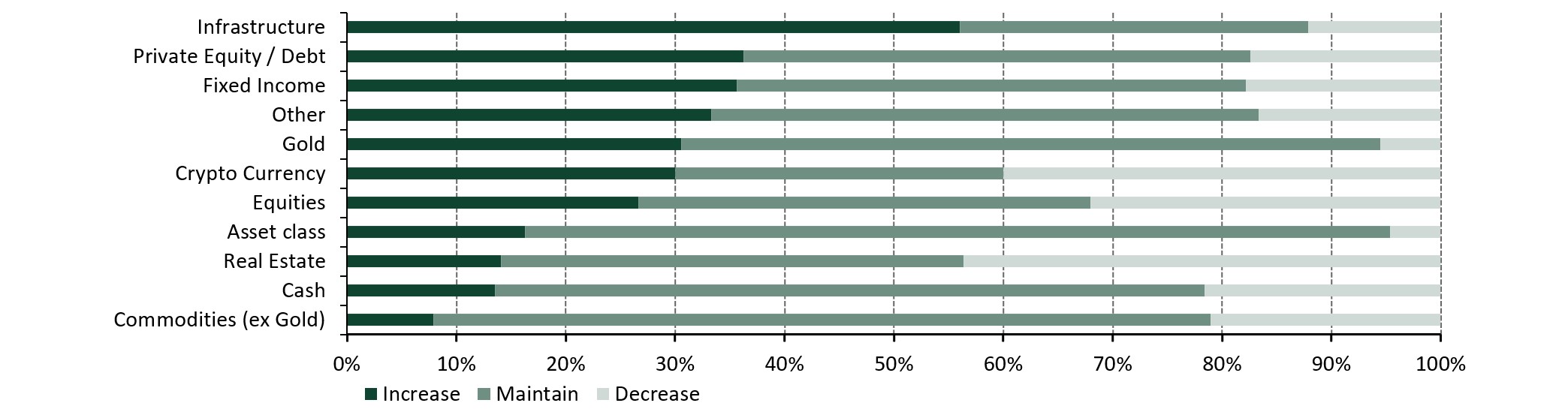 Respondents indicated that they planned to increase allocations to infrastructure (56%), private equity/debt (36%) and real estate (14%), at the expense of more mainstream asset classes such as equities and, to a lesser extent, cash. Findings from Willis Towers Watson also show that by the end of 2020 alternative assets accounted for 26% of all pension fund assets, up from 23% in 2019.2