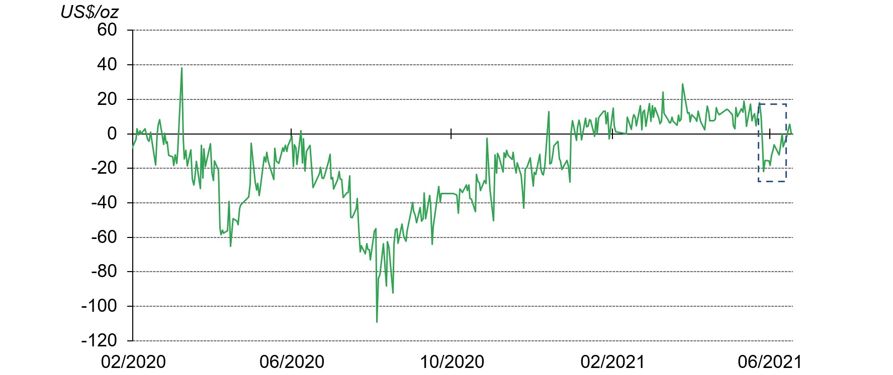 The Shanghai-London gold price spread again turned negative in June after being positive since early 2021,1 falling to -US$6.7/oz on 2 June and remaining negative most days during the month. We believe this is likely driven by: