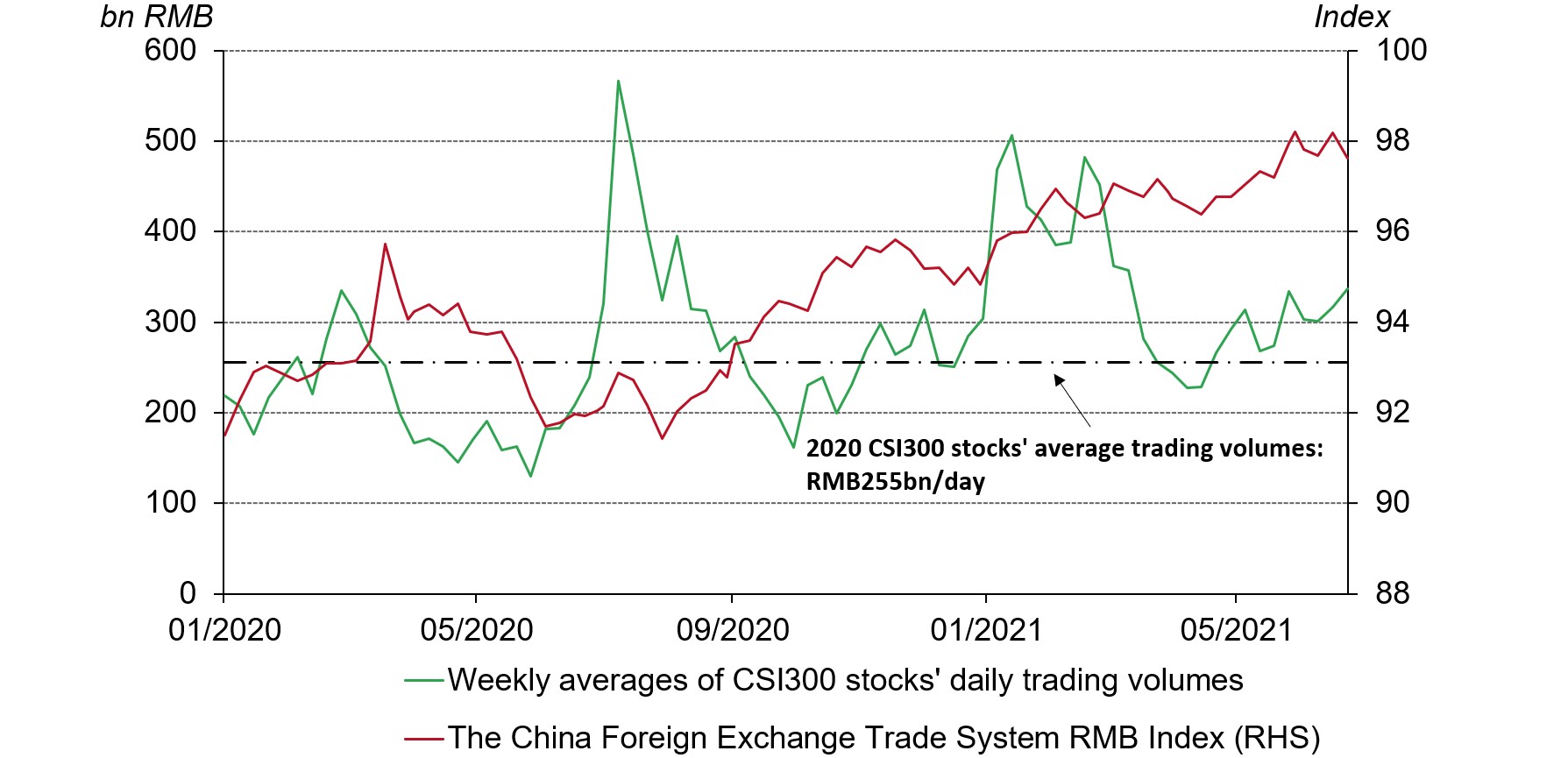 Such divergence could be a result of a higher risk appetite among Chinese investors than their Western counterparts. First, the Chinese renminbi index – an index developed by the China Foreign Exchange Trade System to reflect the RMB’s strength against a basket of currencies – has climbed rapidly recently. A strong local currency usually results in a higher risk tolerance from local investors as it often indicates a strengthening in the local economy. This has, in turn, pushed up trading volumes on the local stock market and lowered Chinese investors’ interest in safe-haven assets such as gold.