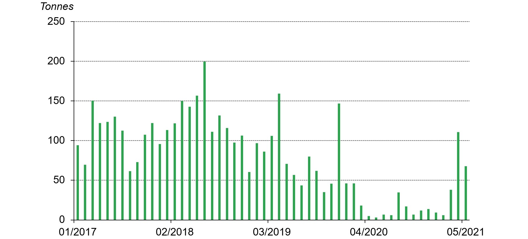 Recent jumps in China’s gold imports have also lowered the local gold price spread. The authorities’ restrictive controls on gold import quotas have, on most days, contributed to a premium in the Chinese local gold price (except during 2020 when local gold demand was severely hampered).4 After remaining subdued in 2020 and early 2021 amid the COVID-19 pandemic, China’s gold imports rose rapidly – 54t in Q1 2021 and a total of 178t in April and May – primarily driven by rising gold consumption and an easing of restrictions on gold inflows. This increase in gold import quotas has also played a role in driving down the local gold price spread in recent months as there is an expectation that China’s gold imports will increase further in the coming months, thus reducing the “scarcity” of gold in China – a factor that may have been exacerbated by lower than expected investor demand for the reasons explained above.5