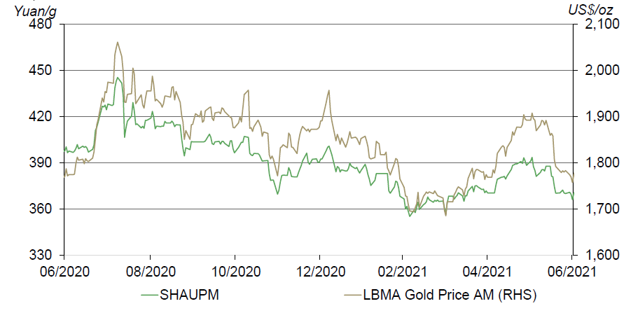 - The Shanghai Gold Benchmark Price PM (SHAUPM) (RMB) and the LBMA Gold Price AM (USD) dropped by 6.4% and 7.1% respectively in June1