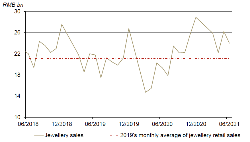 Jewellery retail sales so far in 2021 have remained above their 2019 average