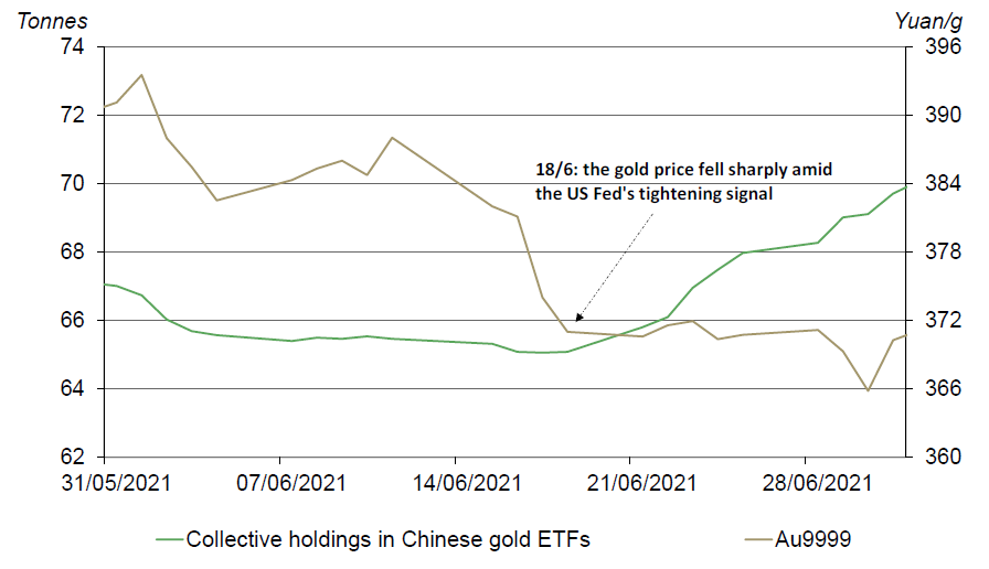 International gold prices fell steeply in June. The weakness in the gold price can be largely attributed to the more-hawkish-than-expected monetary-tightening signals from the US Federal Reserve’s meeting on 18 June.5 But the decline in the RMB gold price was narrower than that of the USD gold price, thanks to a 1.6% depreciation in the CNY against the dollar last month.6