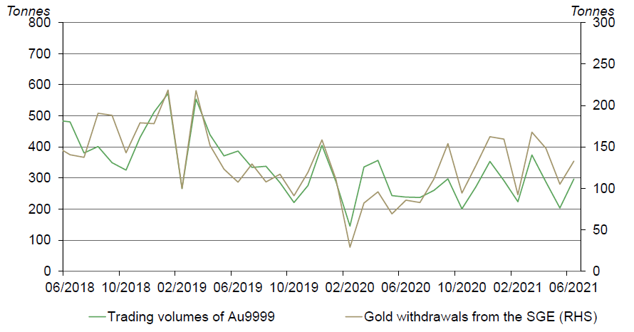 - Trading volumes of Au(T+D) on the Shanghai Gold Exchange (SGE) and gold futures on the Shanghai Futures Exchange (SHFE) hovered around previous lows