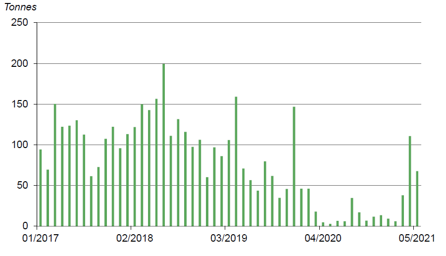 China’s gold imports were 67.6t in May, 65t higher y-o-y and only 3t lower than May 2019. China’s gold imports were muted in 2020 amid the pandemic-led plunge in local gold demand and strict border controls. But with the global COVID-19 pandemic easing and local demand improving, China’s appetite for gold imports has been recovering since early 2021, and is gradually normalising to its pre-pandemic level.