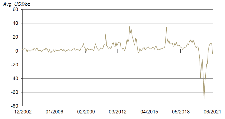 The Shanghai-London gold price spread averaged -US$4/oz in June, the lowest since December 2020. As mentioned in my previous blog, the higher risk appetite of Chinese investors in comparison to their Western peers, the expectation of tighter regulations in China’s gold market, and the recent surge in China’s gold imports, were principal drivers of the first negative Shanghai-London gold price spread in 2021, on a monthly average basis.
