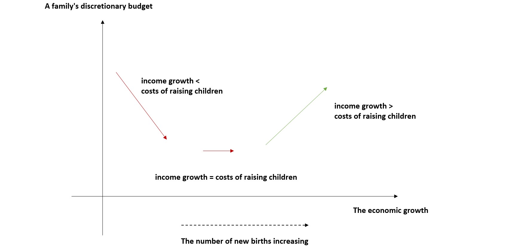 In the future it is possible that incentives may be offered for families to have more children and this would, over the longer term, change the relationship between the cost of raising children and the family’s discretionary budget. As previously mentioned, a higher birth rate has been positively linked to economic growth in the long run. Therefore, there is likely a turning point when the growth in a family’s income outweighs the reduction in its discretionary budget.