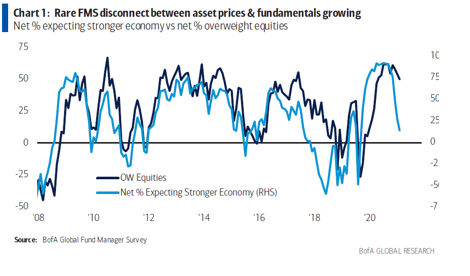 The September edition of Bank of America’s bellwether Global Fund Manager Survey highlights a growing disconnect between fund managers’ expectations and their positioning: funds remain heavily overweight equities despite increasing pessimism over global economic prospects.