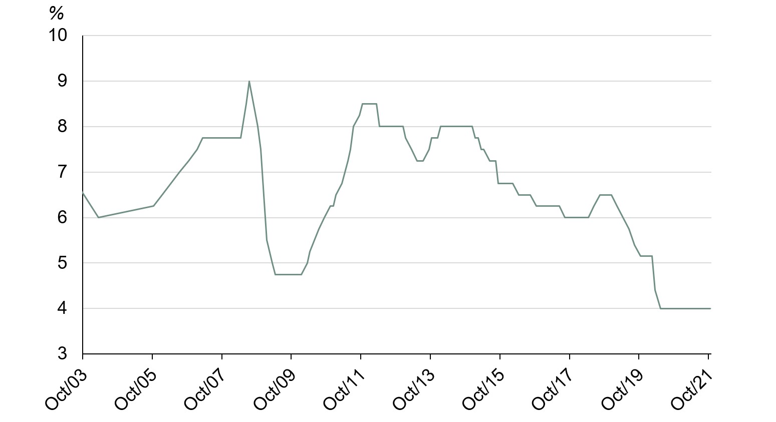 At its latest monetary policy committee meeting the RBI kept the policy repo rate unchanged at 4% and stated that it would continue with its accommodative monetary stance to achieve a medium-term target of 4% Consumer Price Inflation (CPI) within a band of +/-2%.