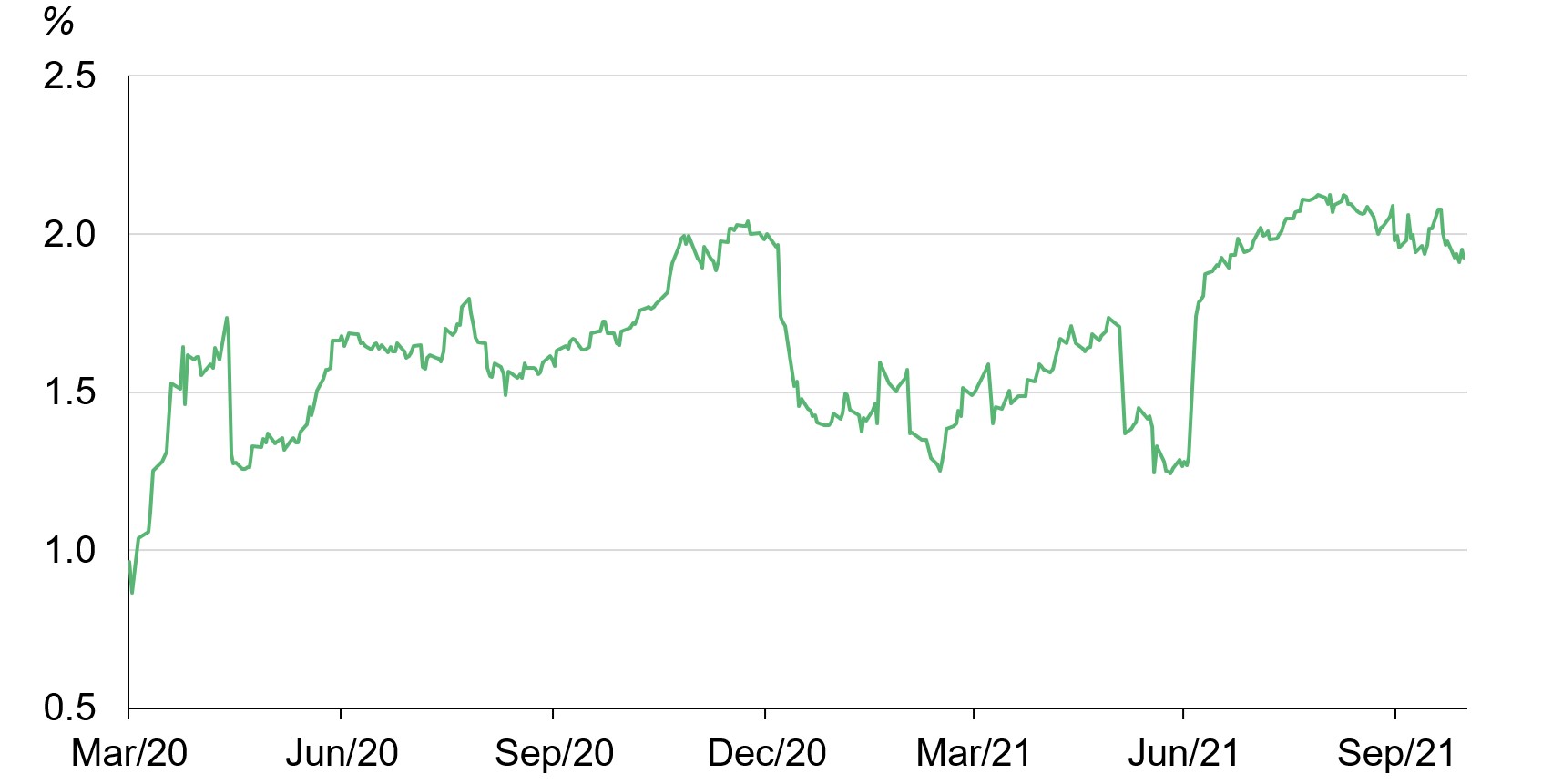 To provide liquidity to the market during the second wave of the pandemic, in April the RBI launched a secondary market G-sec Acquisition Programme (G-SAP).3 Under G-SAP, the RBI made bond purchases of Rs1tn (US$14bn) and Rs1.2tn (US$17bn) in Q2 and Q3 2021 respectively. Signalling the start of tapering, this quantitative easing measure was discontinued at the recent monetary policy meeting, as the RBI aims to reduce surplus cash in the banking system (Chart 2). This huge liquidity, which has swelled to Rs7.7tn (US$100bn) could lead to further steepening of the yield curve and presents an upside risk to inflation (Chart 3).