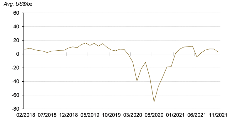 The average monthly spread between SHAUPM and LBMA Gold Price AM in US$/oz*