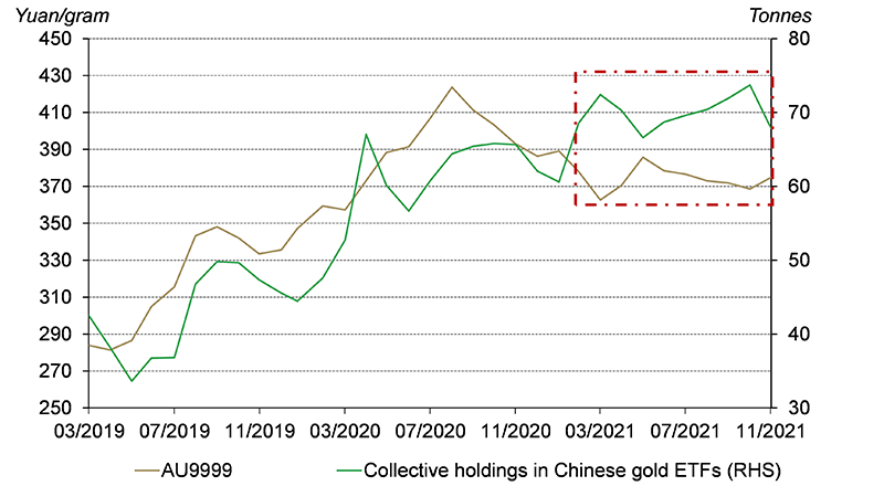 - Holdings in Chinese gold ETFs fell by 6t (US$0.3bn, RMB2bn) in November after five consecutive months of inflows,3 reaching a collective AUM of 68t (US$4bn, RMB25bn )