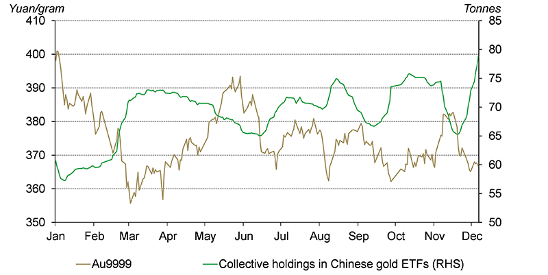 Investor interest in gold ETFs rebounded towards the end of the month possibly due to the gold price weakness – an opportunity to enter the market with lower costs. And as the gold price remained stable, Chinese gold ETF holdings kept rising in December, generating a 10t inflow during the first nine days of the month as of December 9.