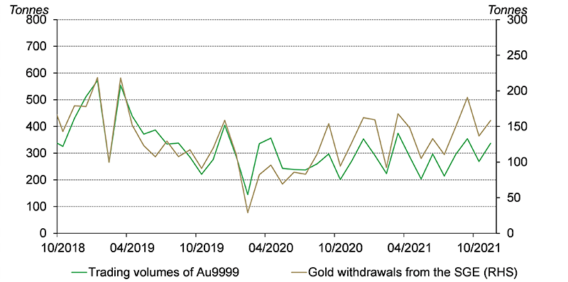 - Wholesale physical gold demand has been strong so far in Q4: gold withdrawals from the Shanghai Gold Exchange (SGE) in November rose m-o-m and October’s gold imports reached the highest since December 2019.